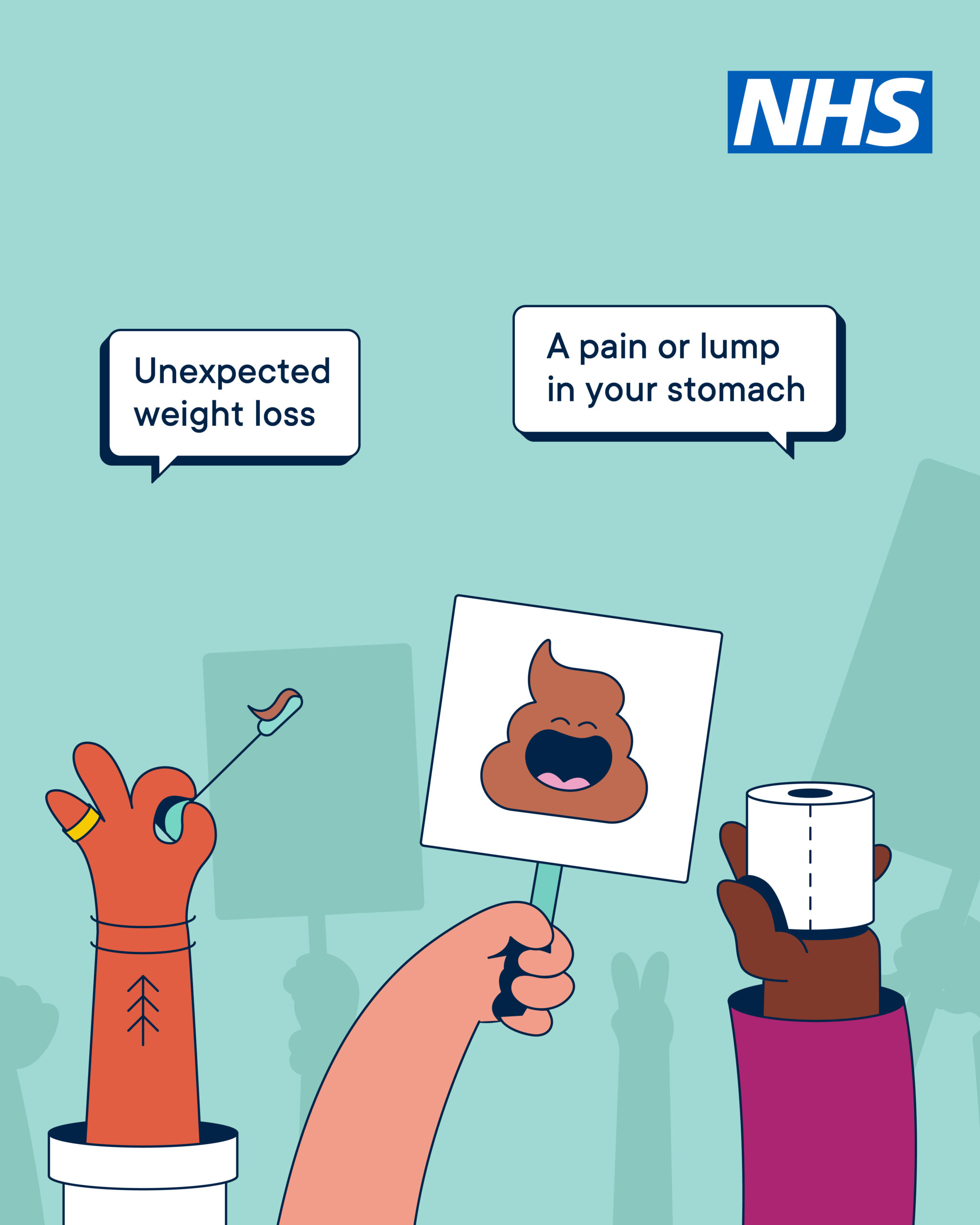 A teal background. Three cartoon hands, one holds a placard with a poo emoji, one holds a toilet roll and one holds part of a bowel cancer screening test. Speech bubbles read: “unexpected weight loss” and “a pain or lump in your stomach” | |