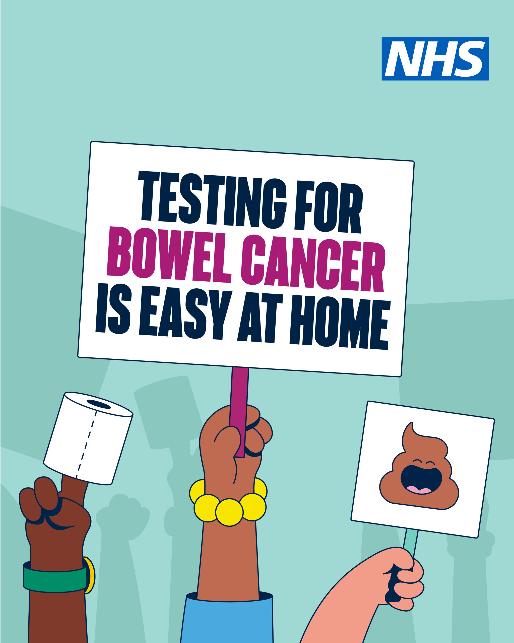 A teal background, with three cartoon hands of different skin tones. One is holding up a screening test, one holds a bowel cancer screening kit, and the third holds a placard with a poo emoji on it. The text reads: A bowel cancer screening kit can save your life. |