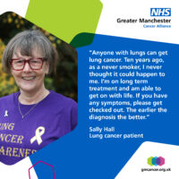 Tile with a blue hexagon and a photo of a lady wearing glasses and a purple t-shirt, smiling at the camera. The copy reads: "Anyone with lungs can get lung cancer. Ten years ago, as a never smoker, i never thought it could happen to me. I am on long term treatment and am able to get on with life. If you have any symptoms please get checked out. The earlier the diagnosis the better. Sally Hall, lung cancer patient." |