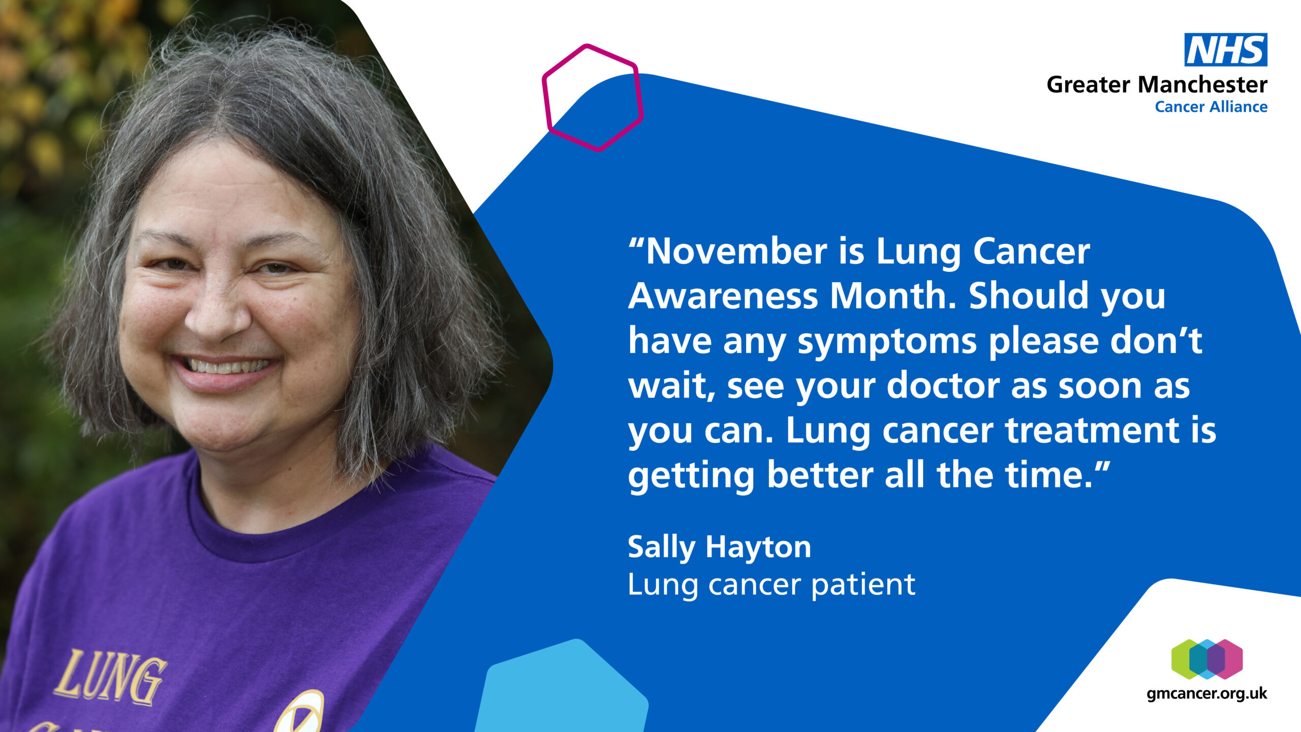 Tile with a blue hexagon and a photo of a lady wearing a purple t-shirt, smiling at the camera. The text reads; "November is Lung Cancer Awareness Month. Should you have any symptoms please don't wait, see your doctor as soon as you can. Lung cancer treatment is getting better all the time. Sally Hayton, lung cancer patient". |